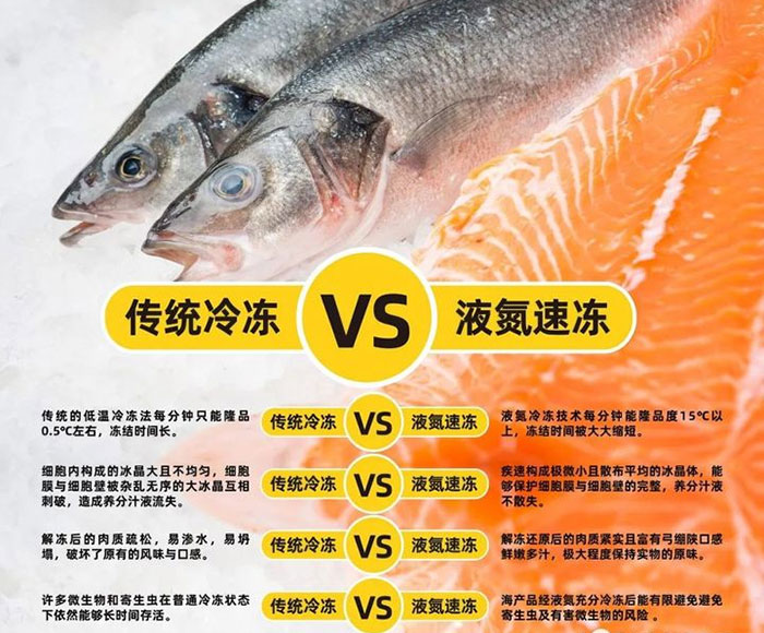 極速急凍,最大化保留海鮮的鮮度傳統冰塊冷凍時間通常要6個小時以上,漫長的降溫過程對蛋白質和結構形成不小的破壞。運用液氮鮮凍技術,在3到12分鐘內完成凍結過程,對組織結構破壞程度大大降低,解凍后的海鮮基本能保持原有新鮮度。保水率高,口感更好由于超速急凍能使細胞內和細胞間隙中的水同時凍結,變成肉眼看不見的無數微細均勻的冰晶體,減少了細胞內水份外析,海鮮汁液不會流失,口感更好。冰晶更微小,海鮮的品質更高由于液氮鮮凍技術的冰晶體是肉眼看不見的、更加微細均勻的冰晶體,細胞組織不受破壞,凍結后的海鮮產品品質也更高。細胞不破壞,營養不流失不破壞細胞組織、不產生營養流失現象,可以提供更加良好的營養價值。更好的隔絕細菌,保證食品安全液氮急速保鮮技術所產生的氣體是隋性的氮氣,液氮在汽化過程中隔絕了空氣起到了保護食品的作用。另外超低溫讓產品速凍時能完全有效殺毒滅菌作用,不需要擔心食品附帶的細菌繁殖破壞食品。