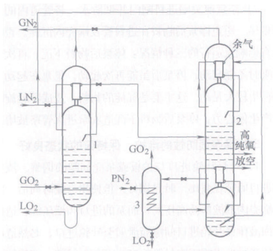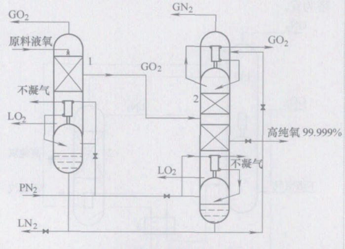 從空分設備主塔抽取的原料氣以接近飽和狀態從高氧塔Ⅰ下部進入,該塔采用液氮為冷源,氧氣在上升的過程中與下流的液體接觸進行熱質交換,高氧塔Ⅰ的主要作用是清除原料氧中大部分高沸點雜質如:氪、氙、二氧化碳和部分碳氫化合物。經高氧塔Ⅰ精餾后的氧氣由塔頂排出,但其中仍含有氮、氬、甲烷等低沸點組分雜質,這部分氧氣再被送入高氧塔Ⅱ的中部,在塔內進一步精餾提純。高氧塔Ⅱ設有上冷凝蒸發器和下冷凝蒸發器,采用壓力氮作熱源,液氮作冷源,氧經精餾后將含有大量低沸點組分雜質的氧氣由塔頂排出;對含有碳氫化合物等高沸點組分雜質的液氧由塔底抽出少量并經汽化排放出系統;產品高純氧由下冷凝蒸發器上方3~5塊板處抽取。在氣相進料的二塔流程中高純氧的提取率一般在20%~25%。由于該流程原料氧氣的純度為 99. 6% ,其優勢是比相應的單塔精餾流程產品提取率高。